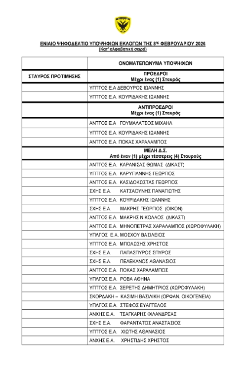 Αρχική σελίδαΑνακοινώσεις Ενιαίο ψηφοδέλτιο υποψηφίων των Εκλογών της 8ης Φεβρουαρίου 2026 13.1.26 Θέμα: Ανακοινώσεις Facebook Twitter